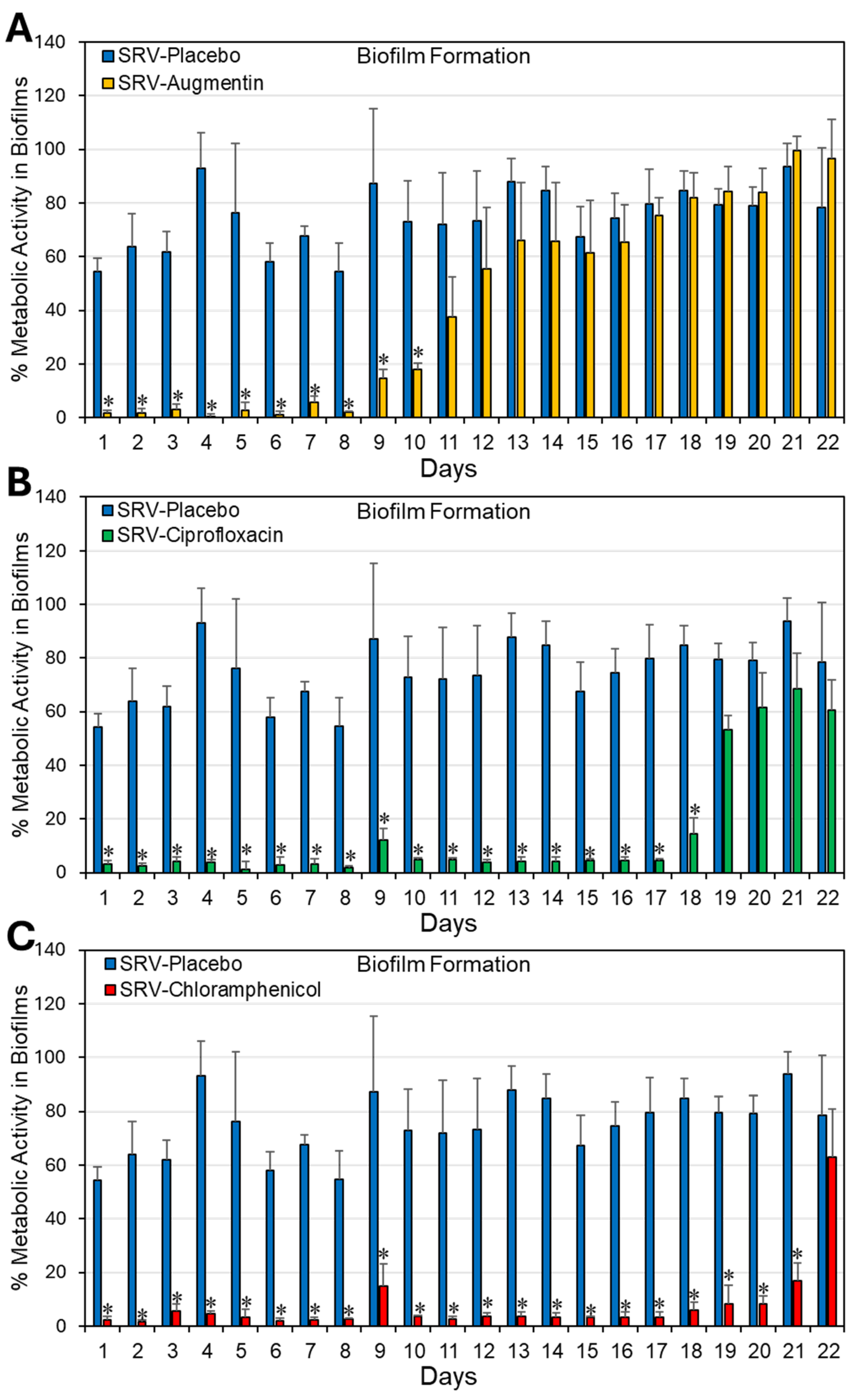 2.3. HR-SEM Images Showed Significant Reduction of Biofilm Formation on Doyle Nasal Silicone Splints Coated with SRV–Antibiotics