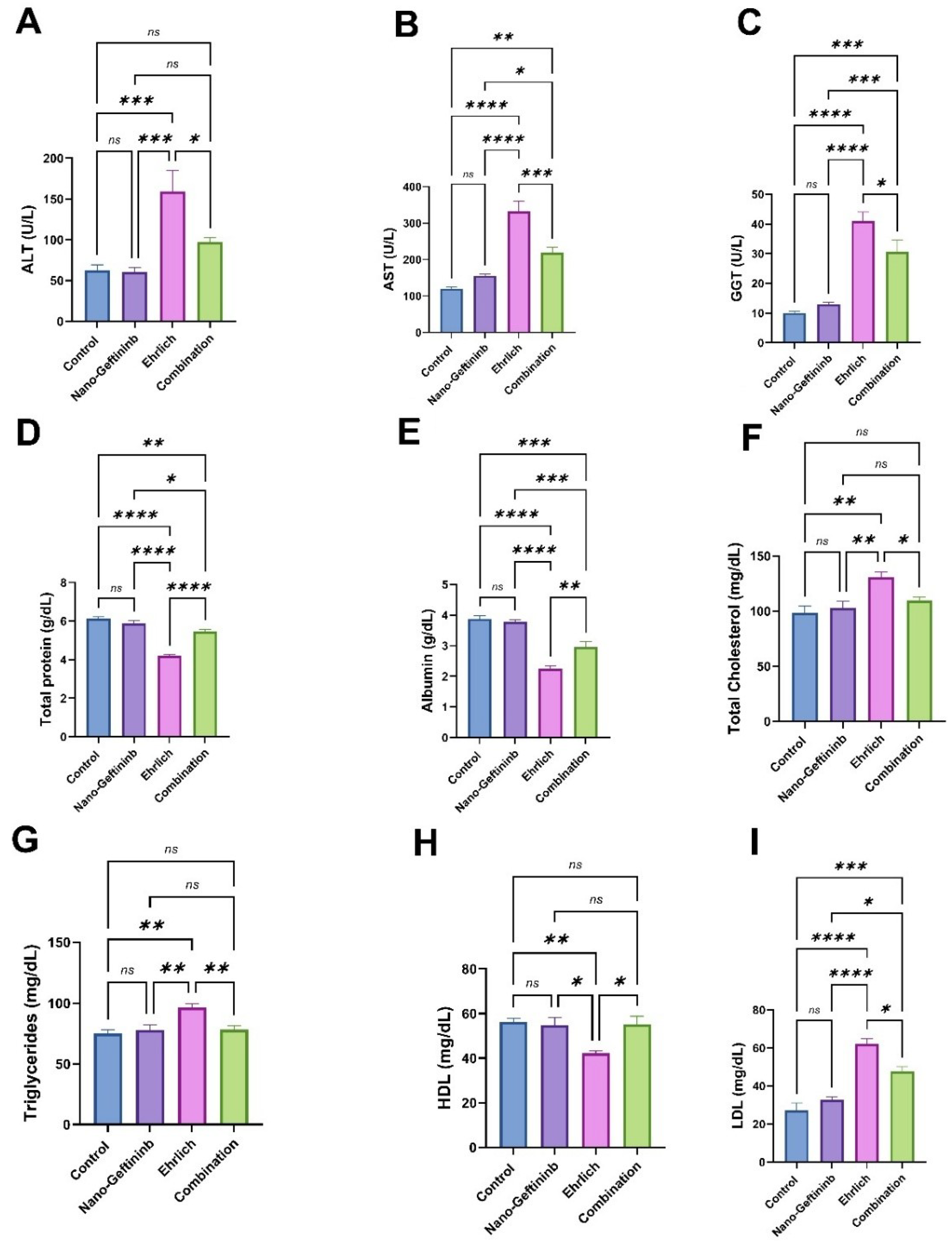 2.5. Effect of Nano-Gefitinib Against Ehrlich Carcinoma-Induced Alterations of Hepatic Function in Mice