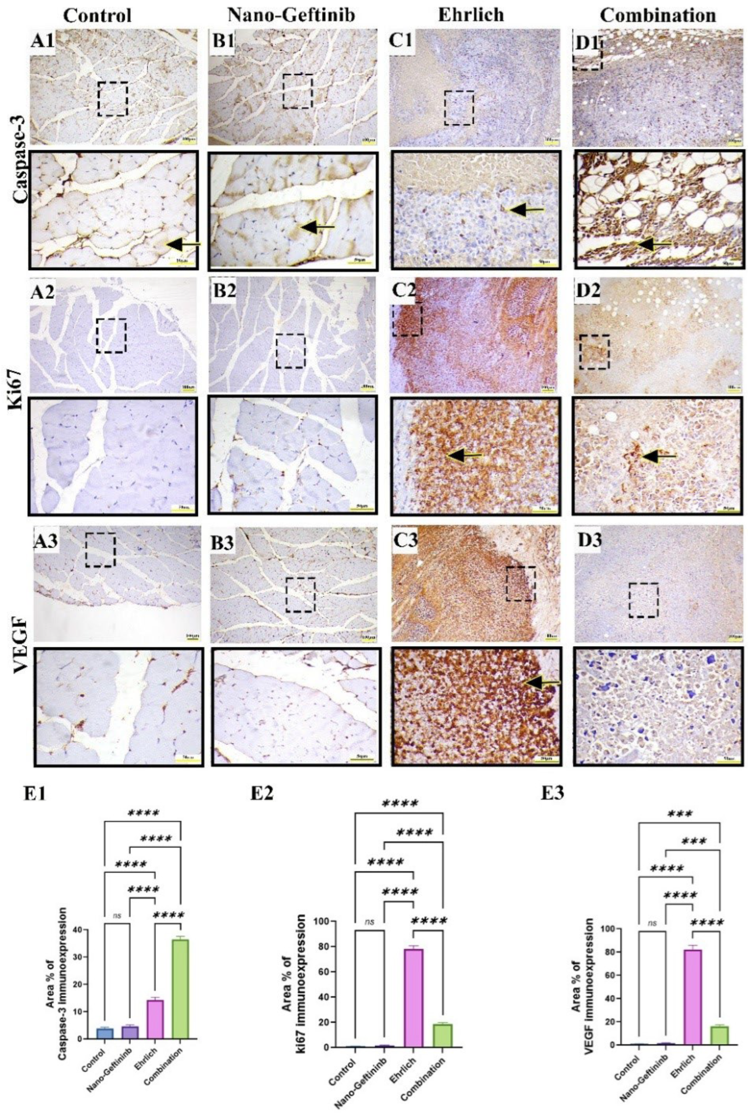 2.8.4. Effect of Nano-Gefitinib on Immunohistochemical Expression of Caspase-3, Ki67, and VEGF1 in Ehrlich Mice Model