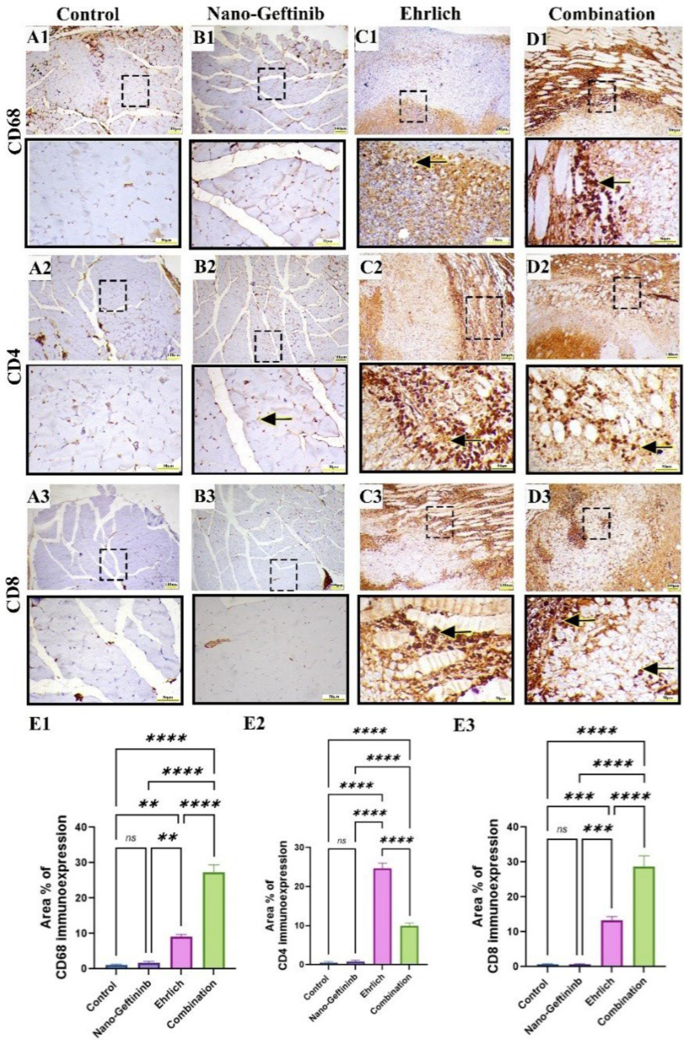2.9. Effect of Nano-Gefitinib on Immunohistochemical Expression of CD68 Macrophage, CD4 and CD8 Lymphocytes in Ehrlich Mice Model