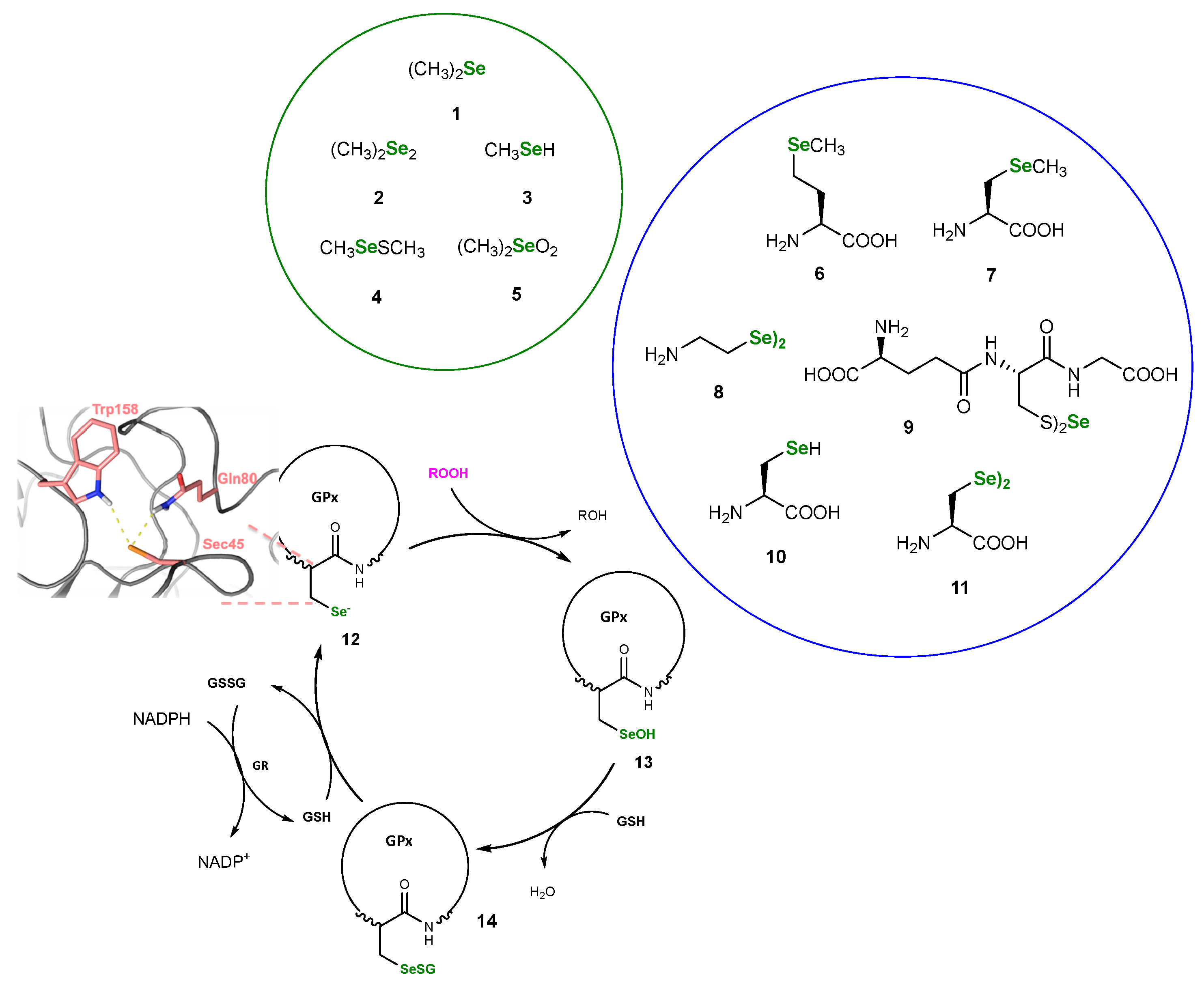 - Pacuła, A.J.; Mangiavacchi, F.; Sancineto, L.; Lenardao, E.J.; Ścianowski, J.; Santi, C. An update on “Selenium containing compounds from poison to drug candidates: A review on the GPx-like activity”. Curr. Chem. Biol. 2015, 9, 97–112. [Google Scholar] [CrossRef]
