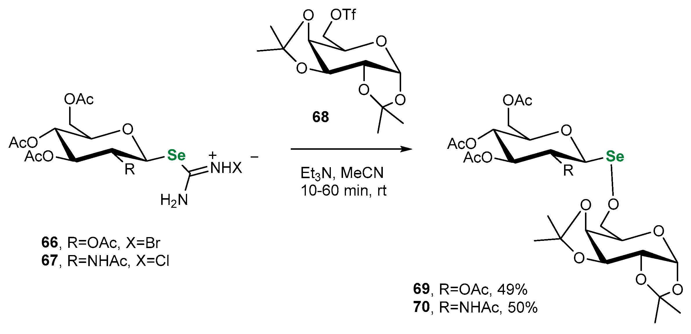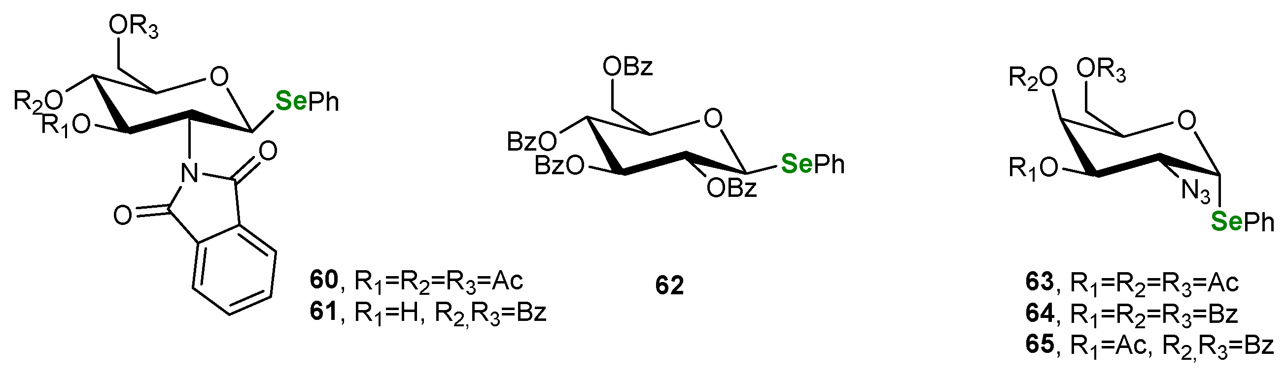 - Kumar, A.A.; Illyes, T.Z.; Kover, K.E.; Szilagyi, L. Convenient syntheses of 1,2-trans selenoglycosides using isoselenuranium salts as glycosylselenenyl transfer reagents. Carbohydr. Res. 2012, 360, 8–18. [Google Scholar] [CrossRef]