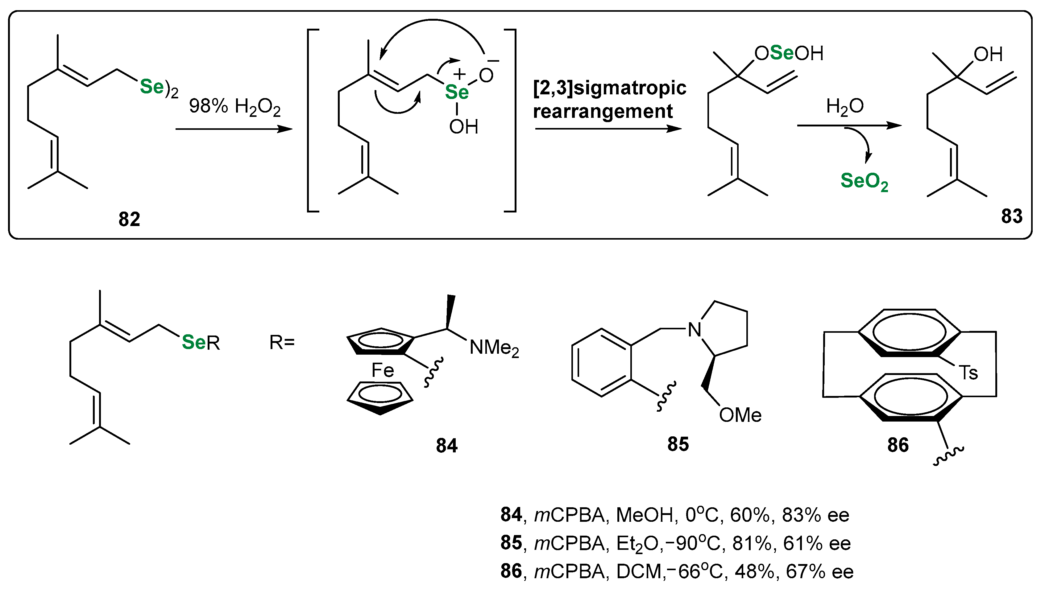 - Kurose, N.; Takahashi, T.; Koizumi, T. Asymmetric [2,3]-sigmatropic rearrangement of chiral selenonium ylides. J. Org. Chem. 1997, 62, 4562–4563. [Google Scholar] [CrossRef]