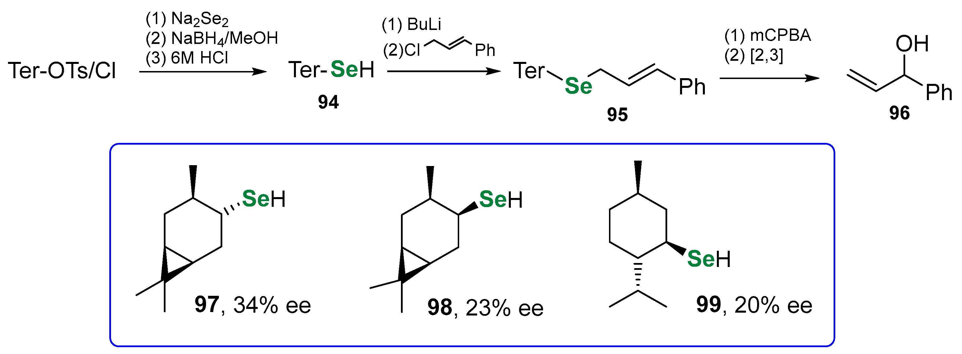 - Tiecco, M.; Testaferri, L.; Marini, F.; Santi, C.; Bagnoli, L.; Temperini, A. Asymmetric oxyselenenylation-deselenylation reactions of alkenes induced by camphor diselenide and ammonium persulfate. A convenient one-pot synthesis of enantiomerically enriched allylic alcohols and ethers. Tetrahedron Asymmetry 1999, 10, 747–757. [Google Scholar] [CrossRef]