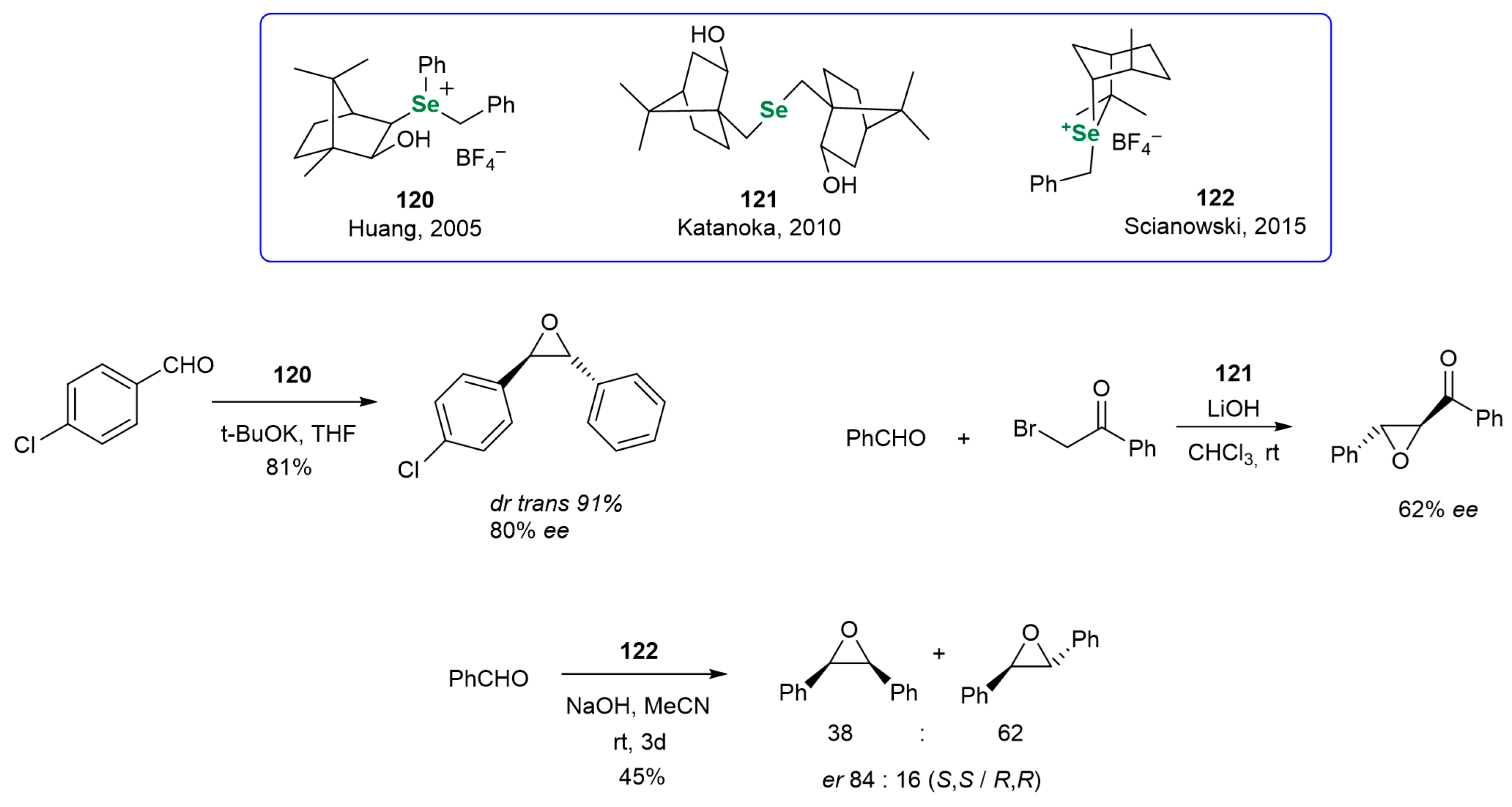 - Watanabe, S.; Hasebe, R.; Ouchi, J.; Nagasawa, H.; Kataoka, T. Enantioselective Darzens reaction using organoselenide-lithium hydroxide complex. Tetrahedron Lett. 2010, 51, 5778–5780. [Google Scholar] [CrossRef]