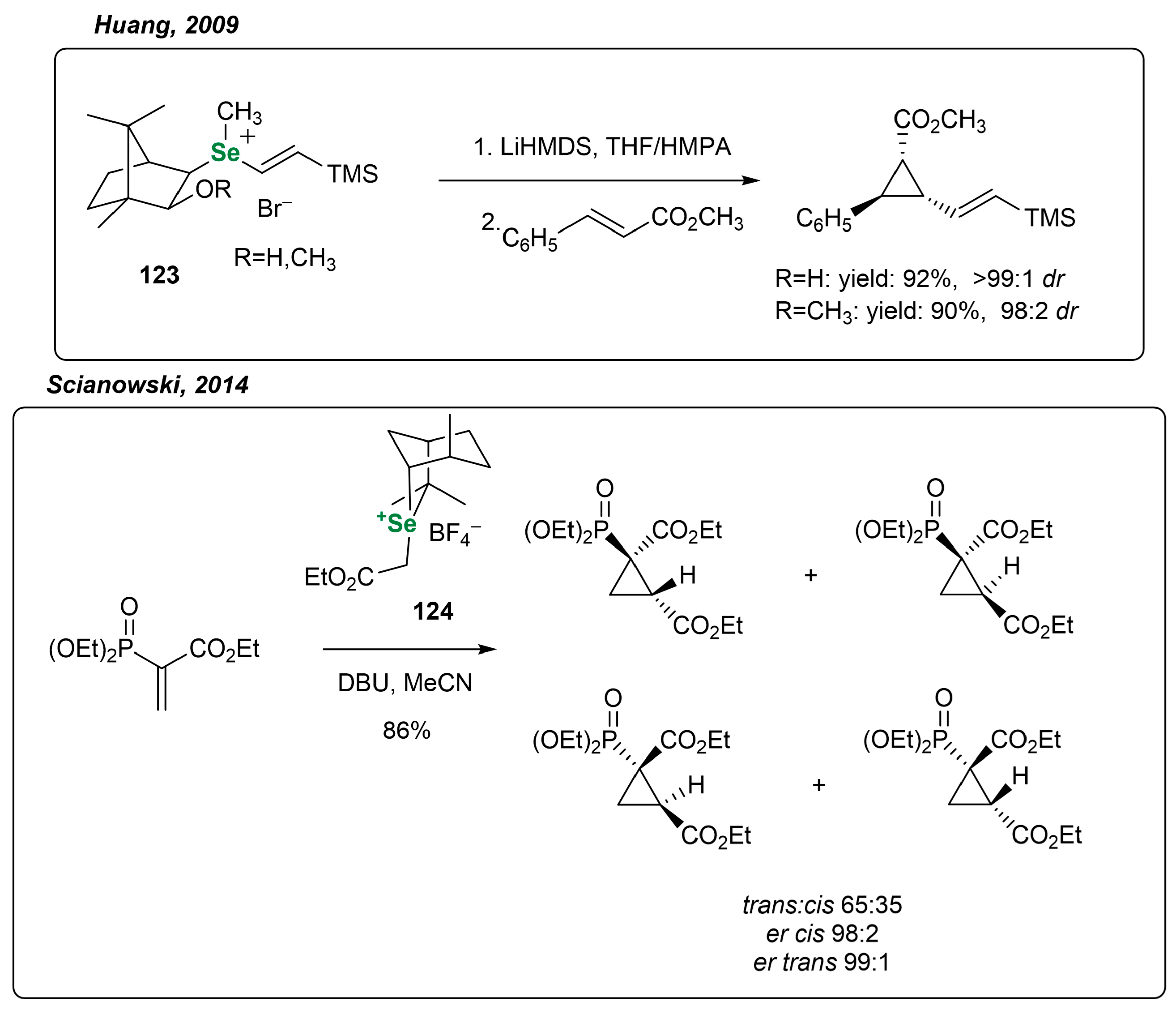 - Wang, H.Y.; Yang, F.; Li, X.L.; Yan, X.M.; Huang, Z.Z. First example of highly stereoselective synthesis of 1,2,3-trisubstituted cyclopropanes via chiral selenonium ylides. Chem. Eur. J. 2009, 15, 3784–3789. [Google Scholar] [CrossRef]
