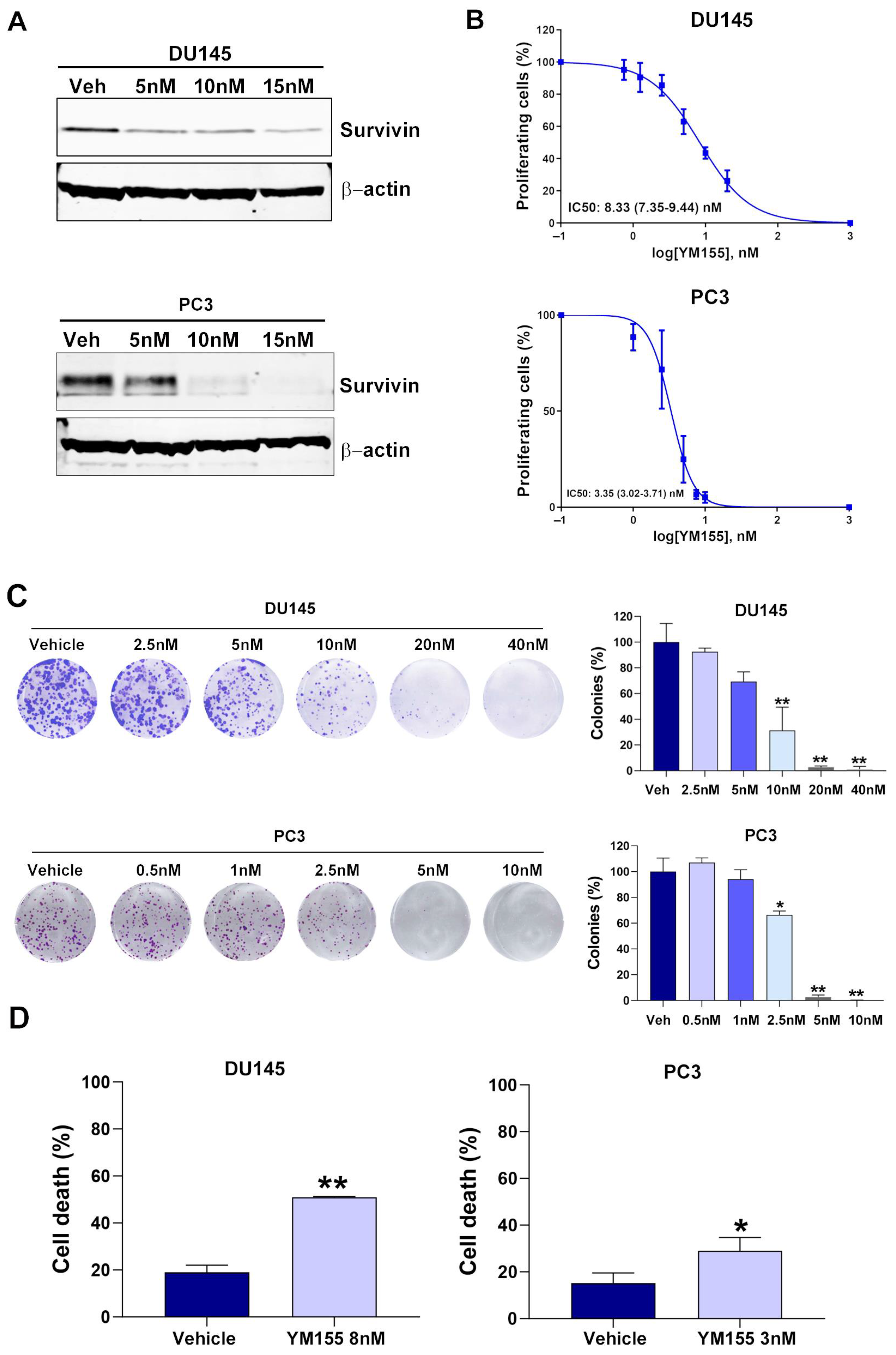 2.3. YM155 Inhibition of Survivin Decreases Cell Proliferation and Induces Cell Death in mCRPC Cell Lines