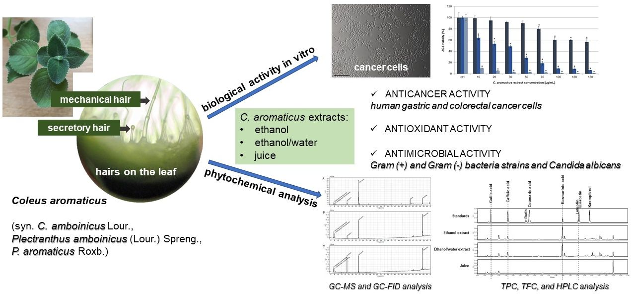Stefanowicz-Hajduk, J.; Hering, A.; Hałasa, R.; Masiak, S.; Turczyn, K.; Ochocka, J.R.; Asztemborska, M. Coleus aromaticus Benth.—A Plant with Strong Anticancer and Antioxidant Potential In Vitro. Pharmaceuticals 2025, 18, 1756. https://doi.org/10.3390/ph18111756