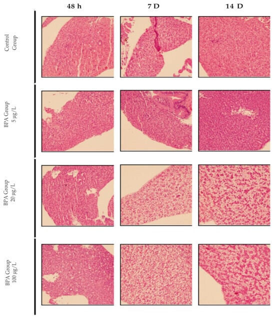 Photomicrograph of adult zebrafish liver with Hematoxylin and Eosin (HE) staining. Representative images of control animals and those exposed to concentrations of 5, 20 and 100 µg/L of BPA at 48 h, 7 D or 14 D. 20× magnification.
