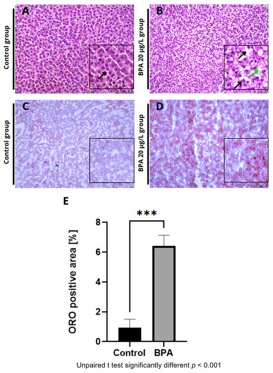 Photomicrographs of adult zebrafish livers stained with Hematoxylin and Eosin (HE) (A,B) and Oil Red O (C,D) at 20× magnification. (A) Control group showing preserved liver parenchyma and cells with a central, spherical nucleus (black arrow). (B) BPA 20 µg/L group showing enlarged hepatocytes containing cytoplasmic vacuoles, with nuclei displaced toward the cell periphery and evidence of ballooning (green arrow). (C) Control group showing no morphological changes and fat droplets dispersed within the liver parenchyma. (D) BPA 20 µg/L group showing lipid droplets stained red (black arrow) in detail. (E) Quantification of the fat deposition area (Oil Red O–positive area). A significant difference (*** p ≤ 0.001) was observed compared with the control group (n = 3). Asterisks indicate a significant difference between the exposed and control groups (Student’s t-test; *** p ≤ 0.001). Image analysis was performed using ImageJ software, version 1.54a (National Institutes of Health, Bethesda, MD, USA).