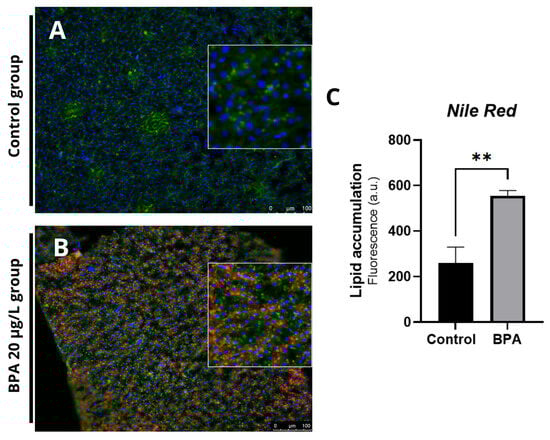 Photomicrograph of adult zebrafish livers stained with Nile Red and observed under a fluorescence microscope at 20× magnification (green staining marks the cytoplasm, blue marks the nucleus, and red marks the lipids). (A) Control group showing no morphological changes and well-preserved cytoplasm. (B) Presence of lipid droplets indicating fat accumulation and cytoplasmic alteration. (C) Lipid content estimated by nile red staining in liver homogenates (20 mg) from zebrafish exposed to BPA and from control livers (n = 3). Results are expressed as arbitrary fluorescence units. Asterisks indicate a significant difference between the exposed and control groups (Student’s t-test; ** p ≤ 0.01).