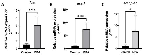 Expression profiles of genes involved in fatty acid synthesis in zebrafish exposed to BPA. Five pools, each consisting of three livers per experimental group, were analyzed in duplicate (n = 5). Data are expressed as mean ± standard deviation. Asterisks indicate significant differences between the exposed and control groups (Student’s t-test * p ≤ 0.05; *** p ≤ 0.001). fasn (fatty acid synthase) (A); acc1 (acetyl-CoA carboxylase 1) (B); srebp-1c (sterol regulatory element-binding transcription factor 1) (C).