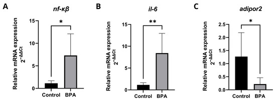 The transcriptional levels of genes involved in the inflammatory process (Figure 5) showed that BPA induced an inflammatory response and inhibited adiponectin receptor, which, in addition to being related to insulin sensitivity and lipid metabolism, has anti-inflammatory properties in the liver. The expression levels of the genes nf-κβ (Figure 5A) and il-6 (Figure 5B) increased significantly, while adipor2 (Figure 5C) expression decreased. Detailed qPCR fold-change values and statistical results are provided in Supplementary Table S1.