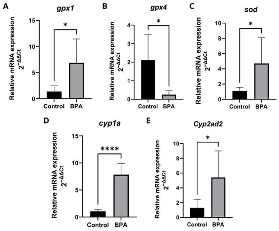 Transcription profiles of genes involved in the antioxidant defense mechanism. Five pools, each consisting of three livers per experimental group, were analyzed in duplicate (n = 5). Data are expressed as mean ± standard deviation. Asterisks indicate significant differences between the exposed and control groups (Student’s t-test * p ≤ 0.05; **** p ≤ 0.0001). gpx1 (glutathione peroxidase 1) (A); gpx4 (glutathione peroxidase 4) (B); sod (superoxide dismutase) (C); cyp1a (cytochrome P450 1A) (D); cyp2ad2 (cytochrome P450 2AD2) (E).