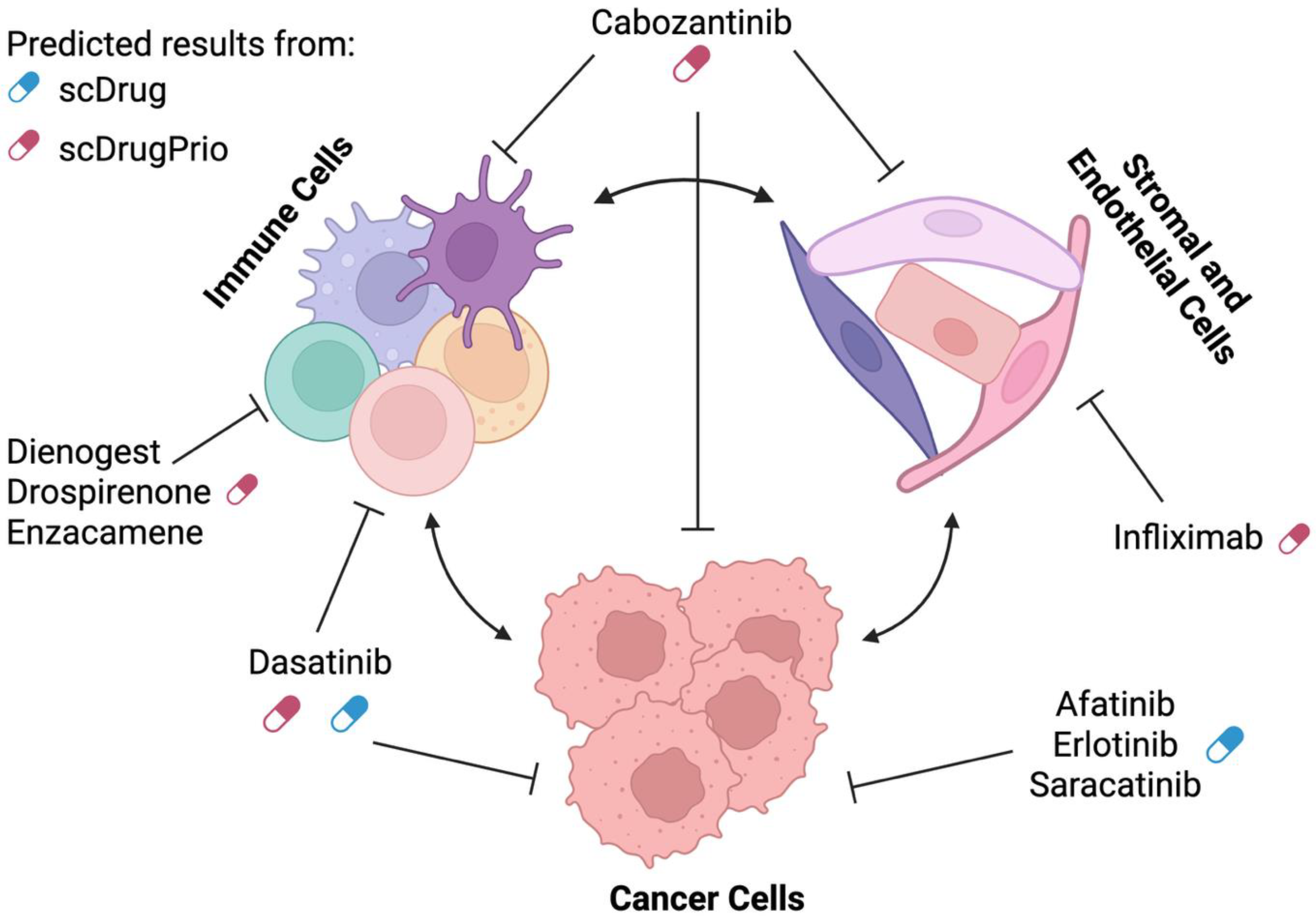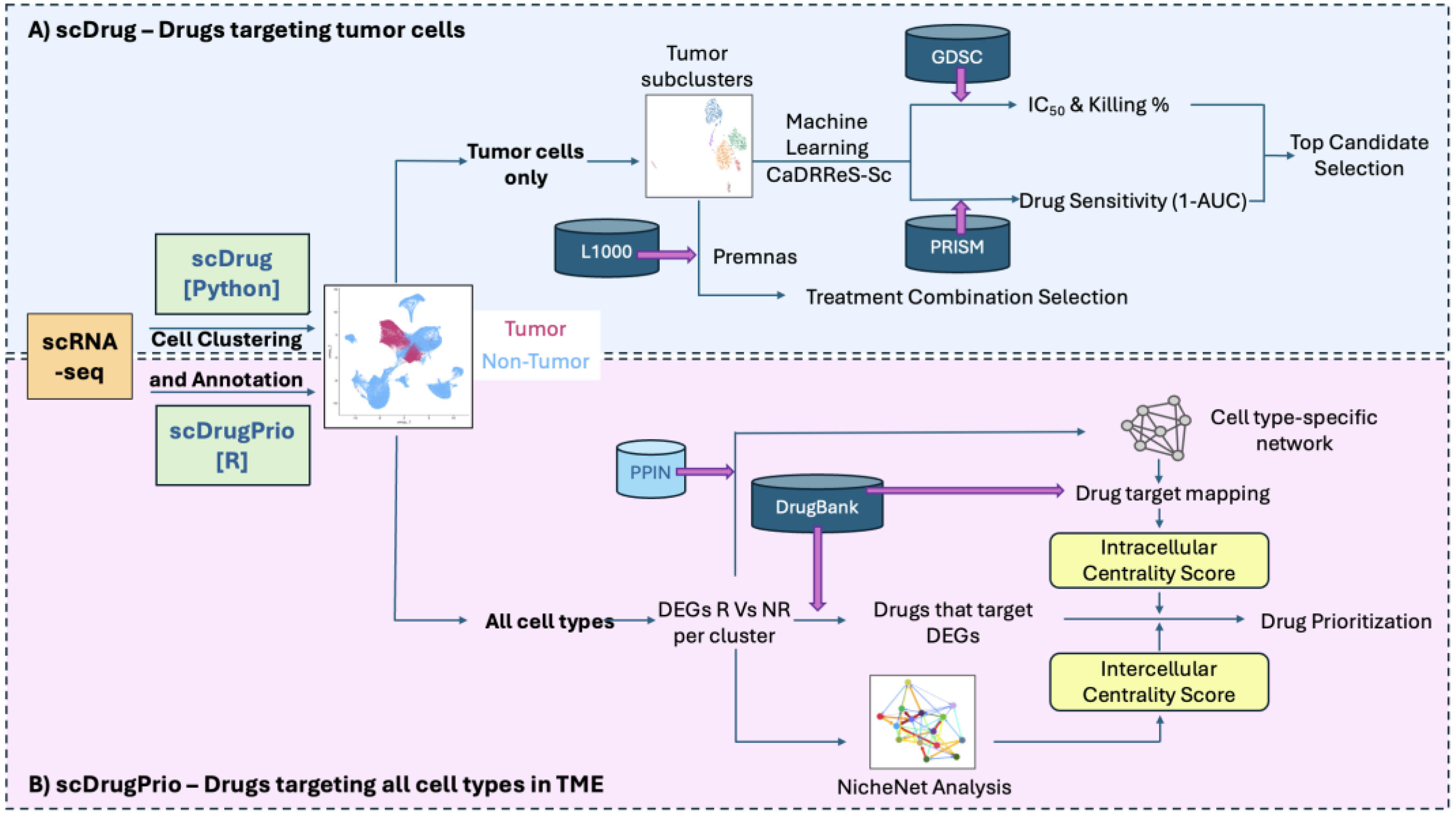 | DrugReSC [98] | R | A method that leverages single-cell RNA-seq data to identify drugs targeting disease-critical cell subpopulations through transcriptional relationship modeling. | Yes Note: Identifies disease-central cells (not restricted to tumor) but uses LINCS for drug matching. |