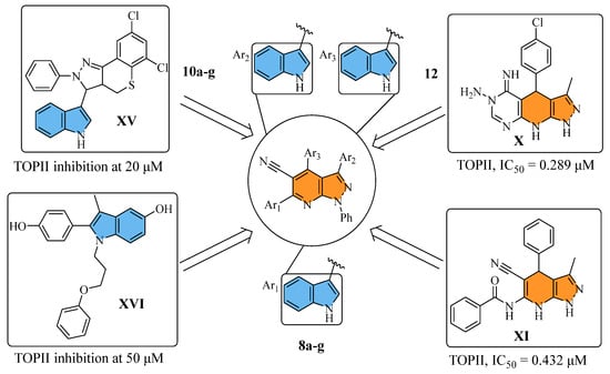 Previous studies have highlighted planar structures as a key pharmacophoric feature of TOPII inhibitors such as the scaffolds found in compounds X [16] and XI [17], both of which contain pyrazolo [3,4-b]pyridine in their structure. Additionally, the indole ring, due to its planar structure, can act as an intercalation site for DNA interaction, as demonstrated by compounds XV and XVI, which showed promising TOPII inhibition activities. All things considered, the compounds in this study were based on a hybridization strategy involving pyrazolo [3,4-b]pyridine as the main scaffold bearing the indole moiety at three varying positions to achieve promising activity against TOPII. As a part of the structure, phenyl rings were also grafted to afford binding interaction with the lipophilic DNA groove binding regions (Figure 3). The obtained compounds were tested in a preliminary anticancer screening at the National Cancer Institute (NCI), and the most promising were subjected to biological mechanistic studies and molecular docking to explore their potential anticancer mechanisms.