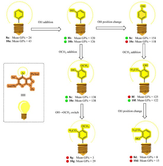 Introducing a methoxy group at the para position adjacent to the hydroxyl group in compounds 8b and 10b resulted in enhanced antiproliferative activity, as observed in the obtained derivatives 8e and 10e, both of which showed a mean GI% of 138. These compounds exerted lethal effects on 39 common cancer cell lines. Lastly, compounds 8e and 10e showed enhanced anticancer activity with mean GI% values of 125 and 122, respectively, when the hydroxyl and methoxy groups were repositioned, with the hydroxyl in the para position and the methoxy in the meta position, as in compounds 8f and 10f with 34 and 35 cancer cell lines were fatally affected by these compounds, respectively.