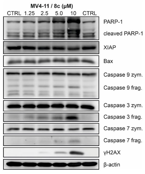 Treatment with 8c efficiently induced the cleavage of initiator caspase-9, which was accompanied by cleavage of executioner caspases −3 and −7. Once activated, they cleave a variety of cellular substrates, including poly(ADP-ribose) polymerase 1 (PARP-1), thereby promoting commitment to cell death [66]. The presence of the cleaved 89 kDa fragment of PARP-1 clearly indicates a concentration-dependent progression of cell death in MV4-11 cells following 8c treatment. This was further associated with a slight increase in the proapoptotic protein Bax and, conversely, a decrease in the antiapoptotic protein XIAP. In addition, 8c induced phosphorylation of histone H2AX at serine 139 (γ-H2AX), indicative of DNA damage, which is likely the trigger responsible for the initial activation of caspases [67,68] (Figure 5).