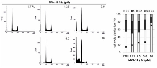 Based on the promising antiproliferative activity observed in the initial screening and SAR analysis, further experiments were conducted to characterize the molecular mechanisms underlying the cytotoxic effects of the most potent compound 8c. Asynchronously growing MV4-11 cells were incubated with increasing concentrations of 8c (1.25, 2.5, 5.0, and 10 µM) for 24 h and subsequently analyzed by immunodetection (Figure 5) and cell cycle flow cytometry (Figure 6).