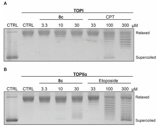 Effect of 8c on the ability of (A) TOPI and (B) TOPIIα to relax supercoiled plasmid DNA at the indicated concentrations using camptothecin (CPT) and etoposide as references.