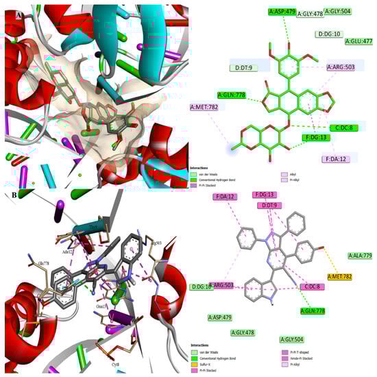 The structure of 8c was subjected to molecular docking modelling in order to assess the potential mode of binding inside TOPII. As anticipated from the best docking pose, 8c fits well into the major groove region of the DNA double helix (Figure 8). The intercalation was observed for the cocrystal with the DNA bases DC8 and DC13, while 8c was observed with DC8, DC9, DC12, and DC13. The π-interactions were observed between these bases and the aromatic systems of 8c, including the main scaffold, one of the phenyl rings, the indole ring, and the phenolic ring. Additionally, the cyano group formed a hydrogen bond with Gln778, and a similar interaction occurred with one of the oxygen atoms of the cocrystal ligand. In addition, lipophilic interactions with Met782 and Arg503 were also observed with 8c. Furthermore, the OH group in the para position enabled sulfur-x interaction with Met782 and improved the π-stacking interaction with DT9. The docking score of 8c (−10.4 kcal/mol) was lower than that of the cocrystal ligand (−14.7 kcal/mol) while maintaining the important interaction patterns.
