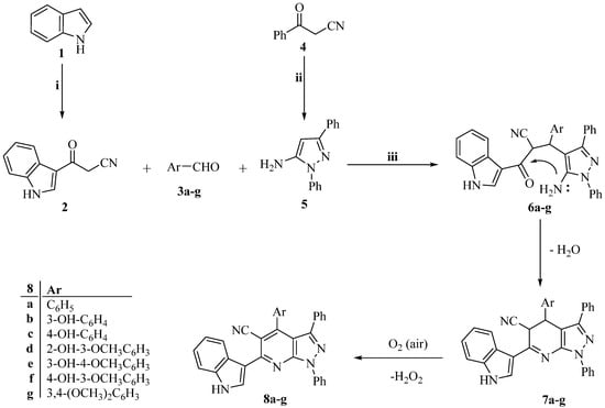 Scheme 1 and Scheme 2 show the synthetic routes taken to produce the target pyrazolo [3,4-b]pyridine derivatives (8a–g, 10a–g, and 12). To obtain 3-(1H-indol-3-yl)-3-oxopropanenitrile (2), indole (1) was heated with cyanoacetic acid, and acetic anhydride was involved [54].