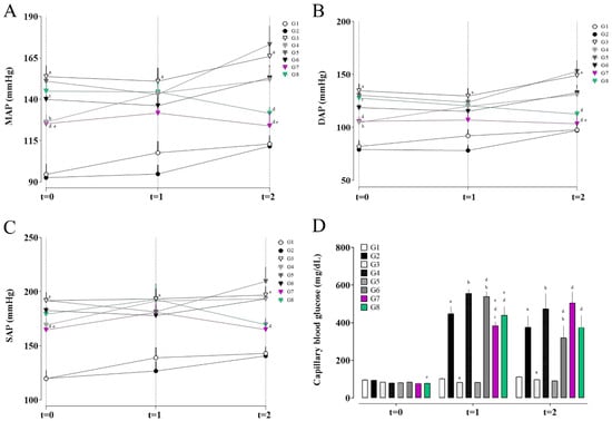 At baseline (t = 0), the Wistar groups (G1 and G2) exhibited similar mean (MAP), diastolic (DAP) and systolic arterial pressure values (SAP) (Figure 1). In contrast, group G3, composed of spontaneously hypertensive rats (SHR), showed significantly higher MAP, DAP and SAP compared to the Wistar G1 group, as expected [16,21,22]. Groups G4 and G6 displayed lower MAP and DAP than G3 at this timepoint, though still elevated, which may be attributed to individual biological variability.