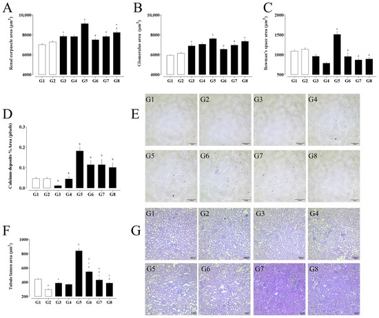 Morphometric analysis of renal structures in experimental groups. (A) Renal corpuscle area, (B) glomerular tuft area, and (C) Bowman’s space area. (D) Percentage area of calcium deposits and (E) representative Von Kossa-stained kidney sections. (F) Tubular lumen area and corresponding (G) hematoxylin and eosin (H&E)-stained histological images. (a) G1 vs. G2 and G3; (b) G3 vs. G4, G5, and G6; (c) G4 vs. G6, G7, and G8; (d) G5 vs. G6, G7, and G8; and (e) G6 vs. G7 and G8. Data are expressed as mean ± SEM. Statistical significance was determined by one-way ANOVA followed by Dunnett’s post hoc test. p < 0.05 was considered significant.