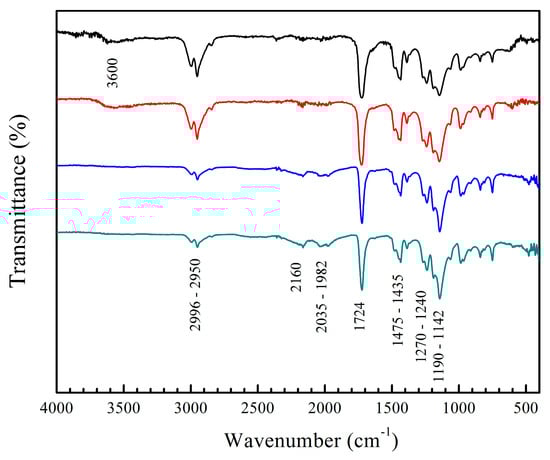 The spectra of the copolymers with 5 wt.% of functional groups before the titration process are shown in Figure 3, as an example. In general, diverse absorption bands of chemical groups are evidenced and confirm the formation of polymers. The spectra of the AA:FA and AA:CUR copolymers reveal a characteristic peak at 3600 cm−1, corresponding to the stretching vibration of hydroxyl groups v(OH)COOH of hydrogen bonding in acrylic acid (AA). In addition, bands at 2996 and 2950 cm−1 are associated with the stretching oscillation of methyl groups v(C–H)CH3 from PMMA. Signals at 2160 cm−1, 2035 cm−1, and 1982 cm−1 are assigned to a Fermi resonance effect of the carbonyl group (–C=O) of PMMA []. This behavior is a combination of the fundamental stretching vibration of the C=O bond along with the symmetric deformation of the C–H group. An extended band at 1724 cm−1 is also attributed to the carbonyl group v(C=O) from PMMA []. The carbonyl v(C=O) binding of pure PMMA typically appears around 1721 cm−1, but in these spectra, it is shifted by the copolymerization process with the AA, FA, and CUR monomers []. Signals at 1475 cm−1 and 1435 cm−1 are associated with the bending of the methylene group δ(C–H)CH2, peaks at 1270 cm−1 and 1240 cm−1 correspond to the stretching motion of ester group v(O=C–O), and absorption bands ranging from 1190 cm−1 to 1142 cm−1 are attributed to the stretching of the C–O–C bond, v(C–O–C) []. All these signals are consistent with the methyl methacrylate structure. The amide and phenolic groups of FA and CUR do not appear in the spectra, because the polymerization process was completed, and the signals are possibly overlapped by the broad PMMA bands. The normal absorptions for primary amides v(N–H)NH2 and stretches of carbonyl groups δ(C=O)CONH2 in the fumaramide could appear at 3330 cm−1 and 1650 cm−1, respectively [,]. Meanwhile, curcumin (CUR) signals, such as the vibration of hydroxyl group v(OH), are detected at 3500 cm−1, and a characteristic peak at 3020 cm−1 indicates the oscillation of methylene group v(C–H), referred to the aromatic ring [,,]. The C–H vibrational frequency appears at 1617–1582 cm−1, corresponding to an aromatic overtone, and the peaks ranging from 1484 to 1415 cm−1 confirm the presence of the aromatic stretching frequency of the benzene ring [,,]. The carbonyl group δ(C=O), along with the vibration of the aromatic ring v(C=C), is observed at 1628 cm−1 [,,]. Finally, the peaks appearing at 1346 and 1116 cm−1 originate from the vibrational frequencies of Csp2–O and Csp3–O bonds, respectively [,,].
