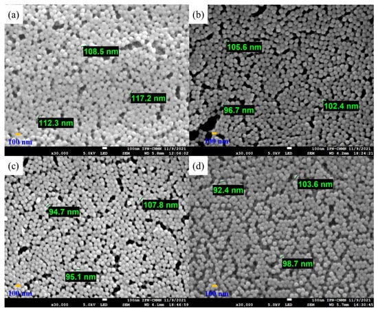Polymeric particles with 5 wt.% of functional groups were analyzed by SEM to study their morphology, shape, surface, and size distributions (Figure 7). The obtained micrographs show well-defined and spherical particles with an average diameter estimated at around 102.92 ± 7.6909 nm for all combinations of chelating agents. The SEM images present a homogeneous distribution of particles. For all cases, they had no significant changes in morphologies, indicating that the polymers were sufficiently stable. Furthermore, it is clear that the effect of different types of monomers and the distribution of functional groups on nanoparticle shape is negligible. On the other hand, the particle sizes are very similar to the data obtained by the DLS.