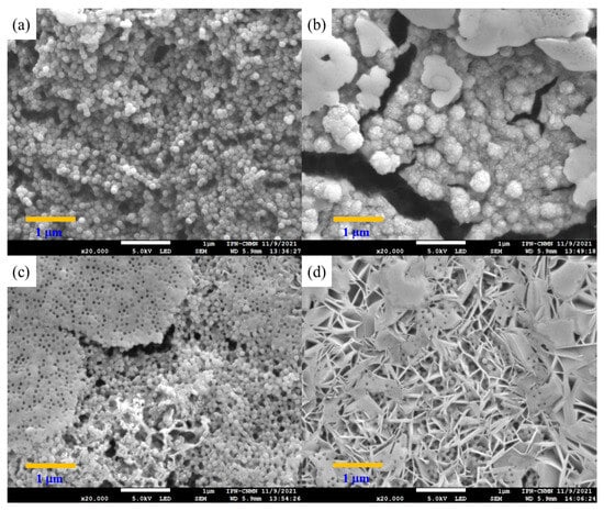 SEM micrographs of the polymeric materials titrated with MgCl2 are shown in Figure 9. The observed conformational changes are more noticeable in these systems because the Mg2+ ion is smaller than the Ca2+ ion and thus has a larger contact surface, resulting in stronger non-covalent associations, as is evidenced in the copolymer poly(AA:FA) (Figure 9a) []. This polymeric material displays a fully interconnected porous structure, in which spherical particles are no longer observed by the physical crosslinking through electrostatic interactions between the negative sites of polymer chains and the positive charges of magnesium ions []. Images of the particles with AA:CUR and AA:FA:CUR ratios are shown in Figure 9b,d, respectively. The materials appear with a disintegrated and agglomerated structure attributed to the strong interaction with the Mg2+ ions, causing restructuring of the chains and leading to a flat and porous structure. Furthermore, the particle size increment could be due to the hygroscopic nature of MgCl2; i.e., the capacity to absorb or attract water, which enhances the swelling degree of materials []. However, poly(FA:CUR) has aggregations of several spherical particles together with polymeric chains. In this case, the repulsive forces between particles decreased in the presence of a counterion, leading to particle agglomeration through electrostatic attraction. This was confirmed by the zeta potential behavior of the materials []. The structural changes in the polymer and their interactions with the Mg2+ ions were even more evident than those obtained with the calcium solution, which could be attributed to the Fermi resonance effect observed in the FT-IR results (Figure 4) and through bathochromic and hypsochromic shifts in UV–Vis (Figure 5).