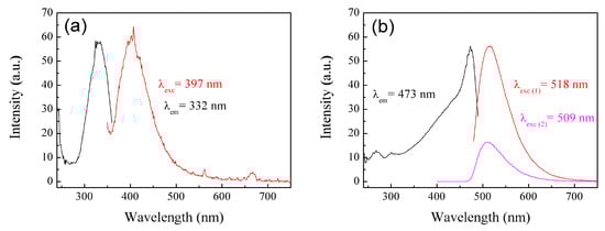 The materials were analyzed using the photoluminescence technique. Photoluminescence (PL) is a process in which a molecule absorbs a photon in the visible region, exciting one of its electrons to a higher electronic excited state, and then radiates a photon as the electron returns to a lower energy state []. If the molecule undergoes internal energy redistribution after the initial photon absorption, the radiated photon is of longer wavelength (lower energy) than the absorbed photon []. PL is an emission of ultraviolet, visible, or infrared photons from an electronically excited species []. The materials poly(AA:FA) and poly(FA:CUR) with 5 wt.% of chelating agents analyzed by photoluminescence spectroscopy before the titration process are shown in Figure 10a,b, as an example. The obtained experimental emission wavelengths (λem) are 332 nm and 473 nm, respectively. This means that the polymers emit below their corresponding excitation wavelength (λexc). In addition, Figure 11 shows the PL spectra of poly(AA:FA:CUR) with 5 wt.% of chelating agents before and after the electrolyte solution was added. The systems show signals with the same emission and excitation wavelength but different intensities, which is attributed to the chelation process []. These results confirm the interactions between the functional groups and the calcium or magnesium ions.