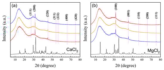 Finally, the cubic structure of CaCl2 is not intact, as some peaks, such as 2θ = 27.26°, 31.56°, and 45.36°, are slightly shifted, indicating deformation in the physical structure of the CaCl2 due to the interactions between the functional groups and Ca2+ ions. The diffractograms for the complexes formed between polymeric particles and MgCl2 show peaks at 2θ = 31.78°, 45.52°, 56.56°, 66.24°, and 75.34°, corresponding to the diffraction planes (100), (001), (110), (200), and (111), respectively. It is also observed that the intensity of peaks decreased at 15.18°, 21.86°, and 30.54°, combined with a shift in peaks at 31.78°, 45.52°, 56.56°, 66.24°, and 75.34°. These effects are caused by the associations between polymeric particles and Mg ions []. The electrolyte-titrated materials exhibit a semicrystalline structure. That is, an amorphous region is attributed to the copolymer, while the crystalline regions are characteristic of the MgCl2 []. According to the results, the XRD patterns indicate that the magnesium structure also suffers from a slight deformation where shifts in 2θ values suggest distortions in the crystalline lattice of the electrolyte [], attributed to its incorporation in the polymeric structure.