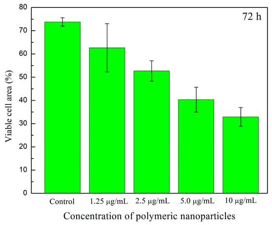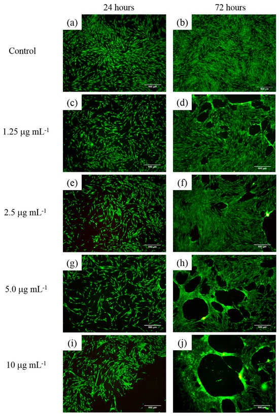 Figure 17a–j shows cell viability assays of human fibroblasts interacting with polymeric nanoparticles (AA:FA:CUR) containing 5 wt.% of chelating agents at concentrations of 1.25, 2.5, 5, and 10 μg mL−1 after 24 and 72 h, as an example. It is important to observe that nanoparticles containing acrylic acid (AA), fumaric acid (FA), and curcumin (CUR) were used to assess the cytotoxic effects of the three chelating groups on human cells. In general, cell proliferation was observed at all nanoparticle concentrations and interaction times (24 and 74 h). This is indicated by increased cell density compared with the control sample, as shown in Figure 17a,b. Moreover, the cells appear green and exhibit a fusiform morphology, suggesting adhesion to the substrate [,,,]. This fluorescence behavior indicates that calcein was internalized, metabolized, and reduced by the cells. In contrast, the red fluorescence from ethidium homodimer staining was weak, indicating that the integrity of the cells was maintained and prevented homodimer penetration into the nuclei. These results demonstrate that the polymeric nanoparticles exhibit low cytotoxic effects in human fibroblasts [,,,]. Specifically, as the concentration of nanoparticles increases, fibroblasts remain viable and maintain complete confluence, as shown in Figure 17c–j. However, after 72 h, an increase in nanoparticle concentration leads to the formation of cell-free areas. This is attributed to the loss of cell–cell interactions caused by the chelation of calcium ions in the medium (from the DMEM solution) by the polymeric nanoparticles [,,,]. This effect is more evident at a nanoparticle concentration of 10 μg mL−1, as shown in Figure 17j. The observed chelation behavior is consistent with the structures shown in SEM images (Figure 8 and Figure 9) and with the structural arrangements suggested by ITC (Figure 16). Figure 18 and Figure 19 show the percentage of the area occupied by viable fibroblasts after 24 and 72 h, respectively. A significant difference was observed between the control and the different nanoparticle concentrations. In Figure 18, no significant differences were found among the four concentrations (1.25, 2.5, 5, and 10 μg mL−1). This corroborates the high cell density observed previously (Figure 17). However, at 72 h, the percentage of the area occupied by these junctions prevented cell adhesion and led to a decrease in viable cells compared to the control. Therefore, a significant difference was observed between the control and the 2.5, 5, and 10 μg mL−1 concentrations, as shown in Figure 19. This behavior is attributed to the calcium-dependent nature of intercellular junctions and the chelation of calcium ions by the nanoparticles. It can be suggested that the sequestration of calcium disrupts the formation of larger cell-free regions over time and with increasing nanoparticle concentration [,,,].