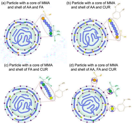The synthesis of particles was conducted in two stages (Figure 1). In the first stage, a core of poly(methyl methacrylate) was prepared, as shown in Figure 1a, while in the second stage, a shell with functional groups was formed, as seen in Figure 1b. Using these methods, four series of methyl methacrylate (MMA)-based polymeric particles functionalized with different proportions of acrylic acid (AA), fumaramide (FA), and curcumin (CUR) as functional agents were created by emulsion polymerization [,,].