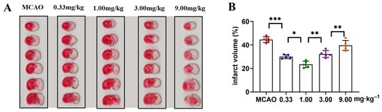 TTC staining analysis of cerebral infarction volume in ST909-treated MCAO rats across dose gradients: (A) Representative TTC-stained coronal brain sections from different treatment groups (doses: 0.33, 1.00, 3.00, 9.00 mg/kg). The unlabeled version is shown in Figure S1. White areas indicate infarcted tissue. (B) Quantitative analysis of infarct volume (One-way ANOVA test in (B), n = 5, the results as shown as mean ± S.D. ***, p < 0.001. **, p < 0.01. *, p < 0.05).