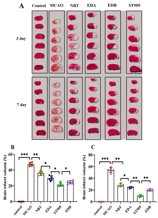 TTC staining analysis of cerebral infarction volume in different treatment groups: (A) Representative TTC-stained coronal brain sections from different treatment groups. White areas indicate infarcted tissue. The unlabeled version is shown in Figure S2. (B) Quantitative analysis of infarct volume in 3 days; (C) Quantitative analysis of infarct volume in 7 days. (One-way ANOVA test in (B,C), n = 6; the results as shown as mean ± S.D. ***, p < 0.001. **, p < 0.01. *, p < 0.05). Data for the 21-day drug treatment are provided in Figure S2 and Table S1.As presented in Figure 2B, we chose first-line clinical drugs NBT and EDA as positive controls. Administration of 20 mg/kg/d NBT via tail vein injection significantly reduced the ischemic area to 35.2 ± 5.7% after 3 days. Similarly, 6 mg/kg/d EDA treatment for 3 days decreased the ischemic area to 27.2 ± 4.3%, showing a statistically significant difference compared to the MCAO group (p < 0.01). In the ST909 group, 3-day administration further reduced the ischemic area to 21.7 ± 5.1%, indicating that ST909′s neuroprotective effect in the subacute phase was significantly superior to both positive controls (p < 0.05).