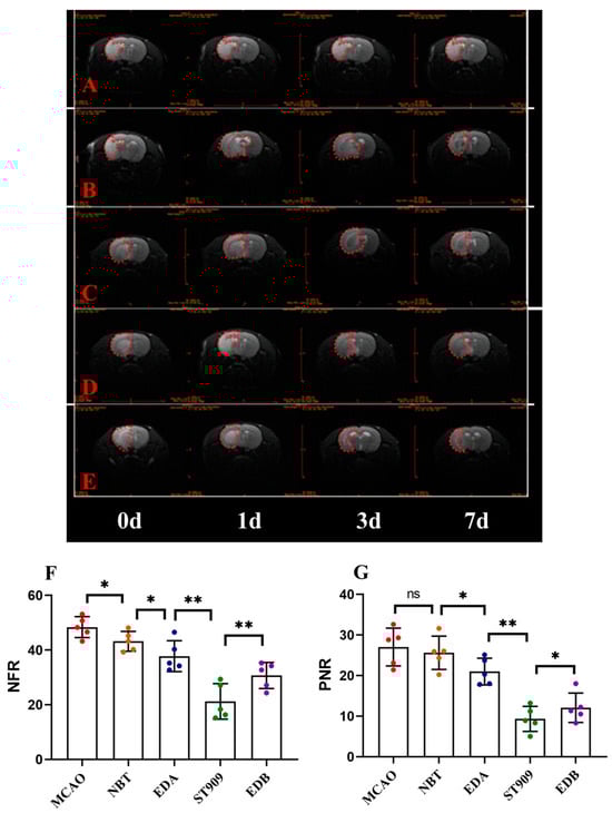 Representative Brain MRI images (A) MCAO; (B) NBT; (C) EDA; (D) EDB; (E) ST909 and relative apparent diffusion coefficient (rADC) value comparison (7 days) (F) NFR; (G) PNR. The unlabeled version is shown in Figure S3. One-way ANOVA test in (F,G), n = 5; the results as shown as mean ± S.D. **, p < 0.01; *, p < 0.05; ns, p > 0.05). The red dotted area represents the brain edema area. The normalized functional recovery (NFR) index reflects the recovery of the lesion area relative to the normal area, while the penumbra-to-normal ratio (PNR) reflects the recovery of the penumbra relative to the normal area. The apparent hemispheric asymmetry observed in MRI images results from pathological cerebral edema secondary to ischemic injury.
