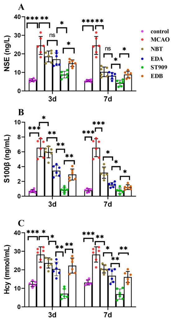Comparison of serum biomarkers (NSE, S100β, Hcy) between 3 and 7 days after ischemic stroke in different treatment group. The statistics were conducted with the One-way ANOVA test (A) NSE; (B) S100β; (C) Hcy. n = 6; the results as shown as mean ± S.D. ***, p < 0.001; **, p < 0.01; *, p < 0.05; ns, p > 0.05).