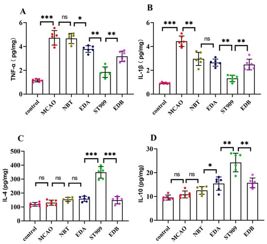 Quantification of inflammatory factors in brain tissue by ELISA. The statistics were conducted with the One-way ANOVA test (A) TNF-α; (B) IL-1β; (C) IL-4; (D) IL-10. n = 6; the results as shown as mean ± S.D. ***, p < 0.001.**, p < 0.01. *, p < 0.05; ns, p > 0.05).