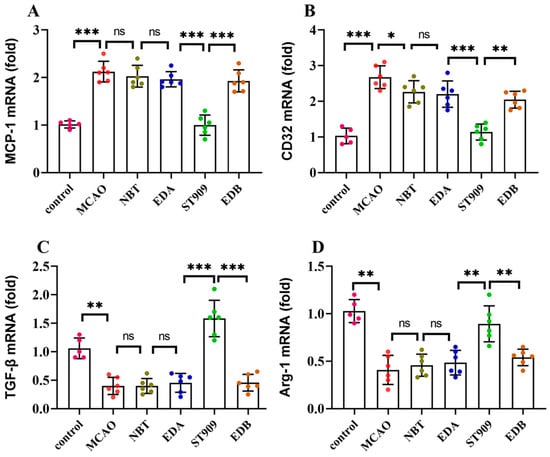 To elucidate the pharmacological mechanisms underlying ST909 modulation of neuroinflammation, we quantified the M1-associated markers (CD32, MCP-1) and M2-associated markers (TGF-β, Arg-1) using RT-qPCR. As shown in Figure 7, the MCAO group exhibited significant upregulation of M1 markers (MCP-1 and CD32) concurrent with suppression of M2 markers (TGF-β and Arg-1) compared with controls (p < 0.01). Conventional therapeutics (NBT, EDA, and EDB) demonstrated limited efficacy in modulating microglial polarization. In contrast, both ST909 therapy significantly downregulated M1 markers (p < 0.001) while upregulating M2 markers (p < 0.01) relative to MCAO controls.