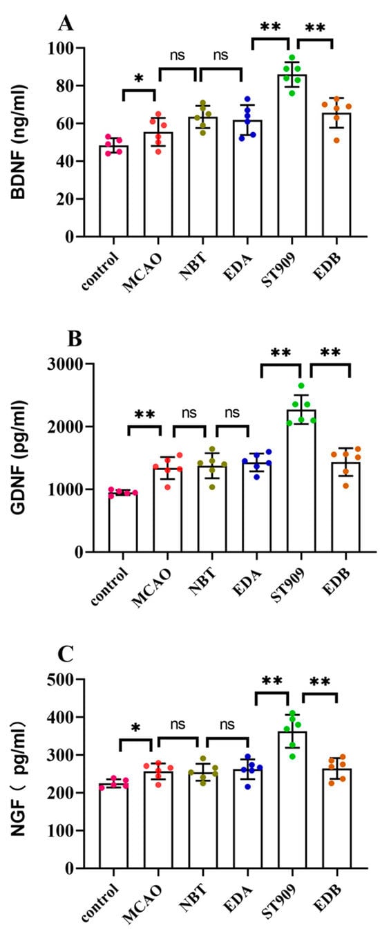 Neurotrophic factor levels in the serum of different treatment groups. The statistics were conducted with the One-way ANOVA test (A) BDNF; (B) GDNF; (C) NGF. n = 6; the results as shown as mean ± S.D. **, p < 0.01. *, p < 0.05; ns, p > 0.05).