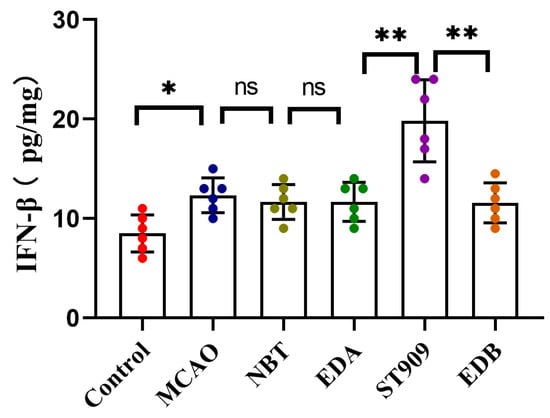 IFN-β expression in brain tissue of different treatment groups. The statistics were conducted with the One-way ANOVA test (n = 6, **, p < 0.01; *, p < 0.05; ns, p > 0.05).