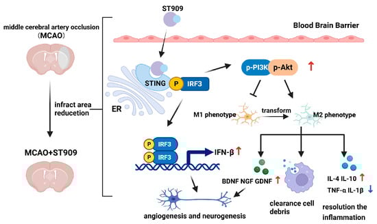 These findings demonstrate that ST909 activates the STING/IRF3 pathway, stimulating IFN-β (Figure 10) and cytokine production to promote angiogenesis and neuroprotection. Moreover, ST909 may indirectly enhance PI3K activation during cerebral ischemia, inducing Akt phosphorylation, shifting microglia toward an anti-inflammatory phenotype, releasing anti-inflammatory mediators, upregulating neurotrophic factors, and exerting anti-apoptotic effects [,].