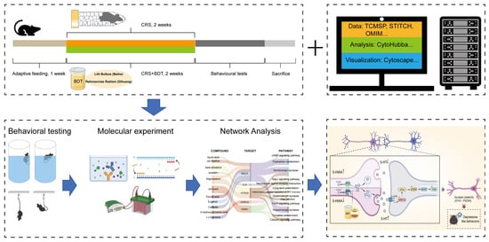 Male C57BL/6J mice (body weight: 20 ± 5 g) were obtained from GemPharmatech Co., Ltd. (Nanjing, China, SCXK (SU) 2023-0009). Mice were housed under controlled conditions (60 ± 5% relative humidity, 24 ± 2 °C) with a standardized 12 h light/dark cycle. After a 7-day acclimation period, mice were randomly assigned to three groups: control (CON), model (CRS), and BDT treatment (BDT). CON and CRS groups received equal volumes of saline. For except for CON group, CRS and BDT groups were subjected to CRS modeling. The CRS protocol was adapted from established methods [34,35,36]. Mice were placed in ventilated 50 mL conical tubes (multiple 2 mm air holes) with cotton padding at the posterior end to maintain restraint. Restraint was conducted daily from 08:00 a.m. to 10:00 a.m. for 2 h, with the modeling period lasting 14 consecutive days. During the modeling period, BDT group received daily intragastric administration of the decoction for 14 days (Figure 2A). All animal experiments and associated procedures received approval from the Animal Ethics Committee of Hangzhou City University (Approval No. 24040) on 25 June 2024.