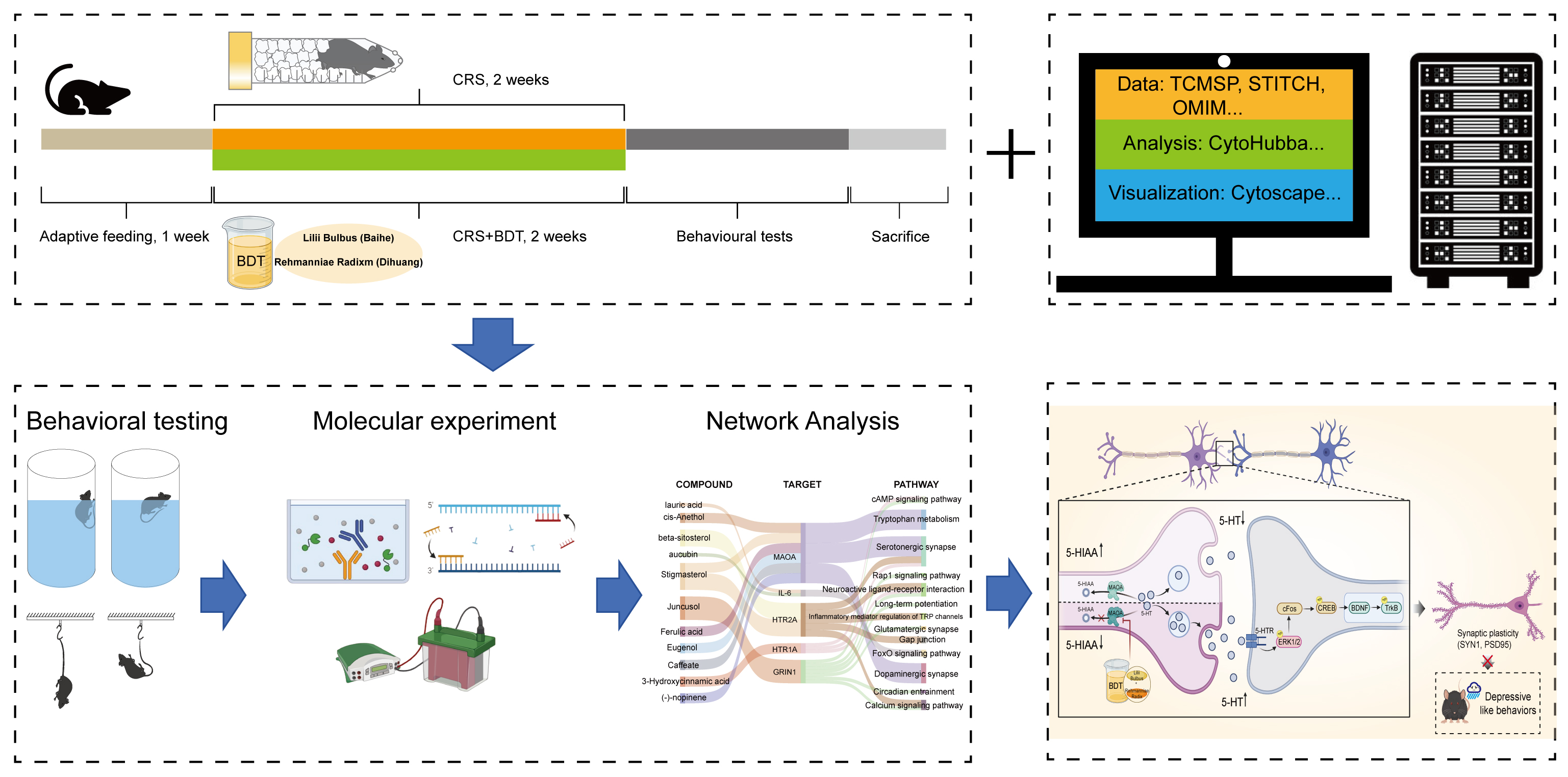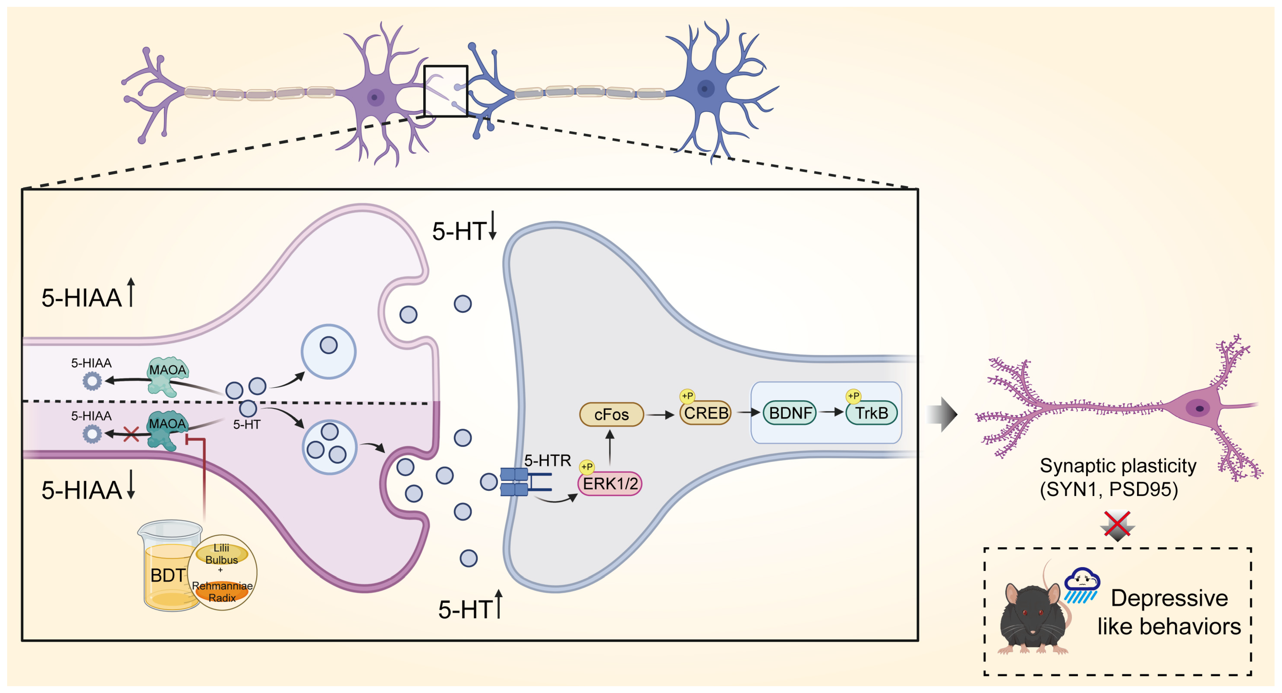 This study aimed to elucidate the antidepressant mechanisms of BDT by investigating its regulatory effects on 5-HT catabolism and synaptic plasticity. Using a chronic restraint stress (CRS) mouse model integrated with network pharmacology and experimental validation. The findings provide mechanistic evidence supporting therapeutic efficacy of BDT in depression and offer a foundation for optimizing its clinical application through targeted modulation of 5-HT metabolism and synaptic function.