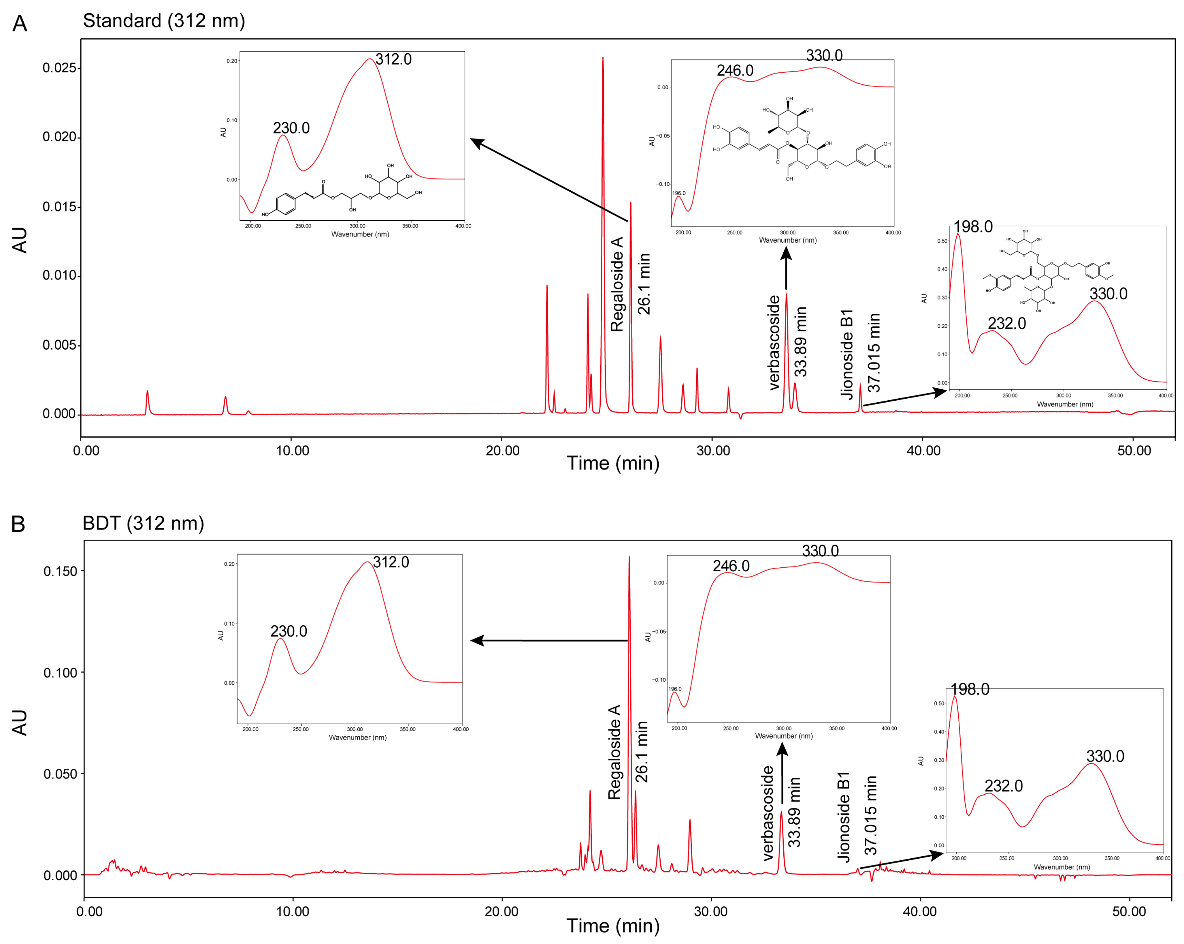 Figure 1. Determination of jionoside B1, regaloside A, and verbascoside in BDT. (A) Retention times (from left to right) and UV absorption peaks of jionoside B1, regaloside A, and verbascoside in a mixed standard. (B) BDT chromatogram (312 nm) showing UV absorption peaks corresponding to jionoside B1, regaloside A, and verbascoside.