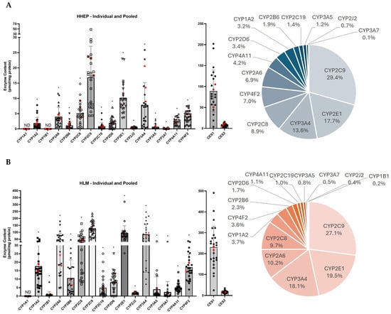 Quantitative analysis and comparative expression of CYP450 and CES protein levels in liver hepatocytes and liver microsomes. CYP2C9 is the most expressed CYP450 in human hepatocytes and liver microsomes: (A) Left—Human hepatocytes (HHEP) were processed and the metabolism enzyme content was analyzed. The enzyme content reported is calculated by using the absolute individual enzyme content (pmol) divided by total CYP450 or CES content (mg protein) for the corresponding sample. The black dots represent the individual HHEP samples, and the red dots represent the pooled HHEP samples. Right—The pie chart represents the percentage of CYP450 pmol/mg protein per total CYP450. (B) Left—Human liver microsomes (HLM) were processed in the same way as in A. The black dots represent the individual HLM samples, and the red dots represent the pooled HLM samples. Right—The pie chart represents the percentage of CYP450 pmol/mg protein per total CYP450. Data are displayed as mean ± standard deviation. ND = not detected. CYP protein levels were analyzed using CYP2C9 as the reference group: * indicates p < 0.0005. Also, see Table 2A,B.