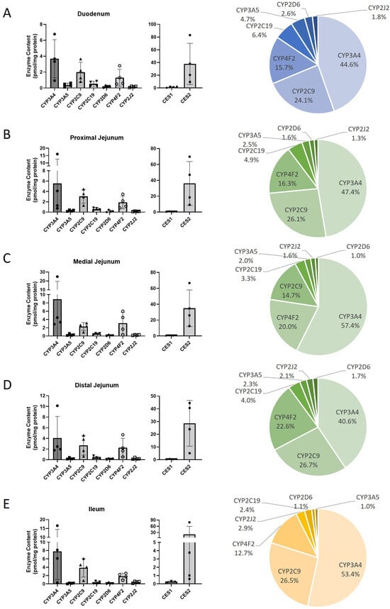 Quantitative analysis of CYP450 and CES protein levels in cryopreserved human intestinal mucosa (CHIM). CYP3A4 is the most expressed CYP450 isoform in the intestine: Left—Cryopreserved human intestinal mucosa (CHIM) sections were processed and the enzyme content was analyzed. (A) Duodenum, (B) proximal jejunum, (C) medial jejunum, (D) distal jejunum, and (E) ileum enzyme content was calculated using the absolute individual enzyme content (pmol) divided by total CYP450 or CES content (mg protein) for the corresponding sample. Right—The pie chart represents the percentage of CYP450 pmol/mg protein per total CYP450. Data are displayed as mean ± standard deviation. Also, see Table 2C and Supplementary Figure S1.