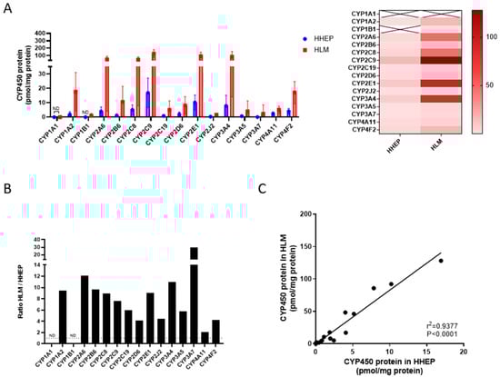Comparative correlation of CYP450 isoform profiles in hepatocytes and microsomal preparations. The CYP450 profiles in HHEPs and HLMs correlate strongly: (A) Left—The CYP450 mean protein contents from HHEPs and HLMs are re-graphed together (same data as Figure 1A,B left) for comparison. Right—The CYP450 mean protein content data (from Figure 1A,B) are represented in a heat map chart. (B) The ratio of CYP450 protein content of HLM/HHEP was calculated. (C) The average CYP450 protein contents from HLMs and HHEPs were plotted in a scatter plot, and correlation analysis was performed. In Figure 2A-left, data are displayed as mean ± standard deviation. ND = not detected. A simple linear regression (C) was performed for statistical analysis. Also, see Table 2 and Table 3.